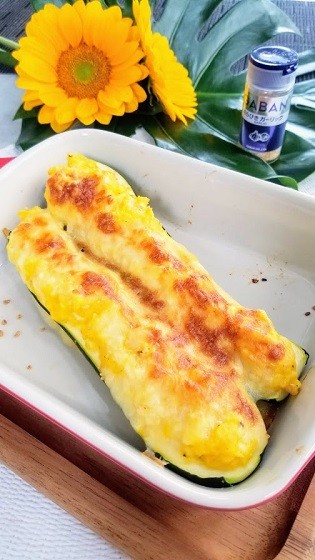 5.ズッキーニを耐熱皿へ入れ、3.をズッキーニの上に盛る。